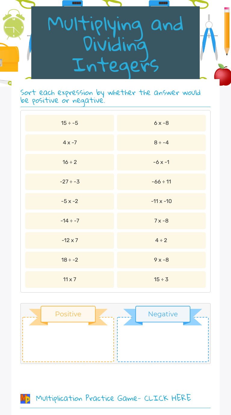 Dividing Integers Worksheet : Integers Worksheets Dynamically Created Integers Worksheets -. You can do the exercises online or download the worksheet as pdf. Odd # of negatives will give you a negative answer. Encourage them to scoop up this additional tool and perform . She repays in four installments. This worksheet can be used to help students practice multiplying and dividing integers.